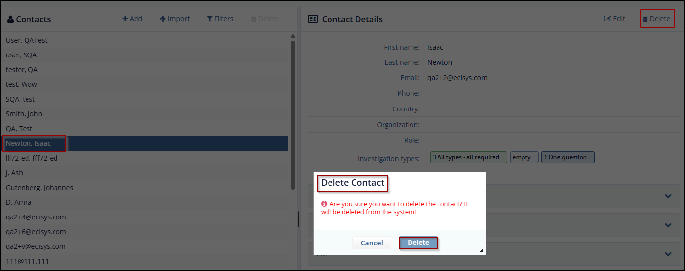 - Click the Delete button from the Contact Details section. The Delete contact pop up window is displayed.