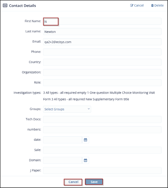 - Edit the fields as required and click Save Contact to save and update the
