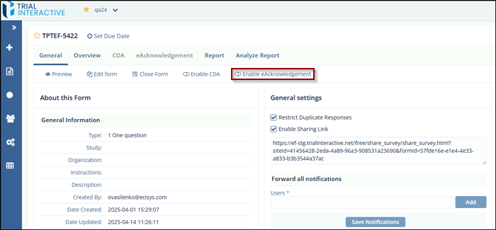 The Enable eAcknowledgement is active once the form is sent, the sponsor will receive an email from the company containing a link to the eAcknowledgement section. The sponsor must click the link and review the provided information. To complete the process, the sponsor must electronically acknowledge the content by submitting the eAcknowledgement form.