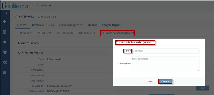 - In the pop-up window, enter a Title for the eAcknowledgement.