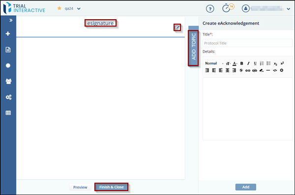 - Click the Create button to save the acknowledgment. The saved eAcknowledgement window will open with a Preview option. If the configuration is complete, click the Finish & Close button.