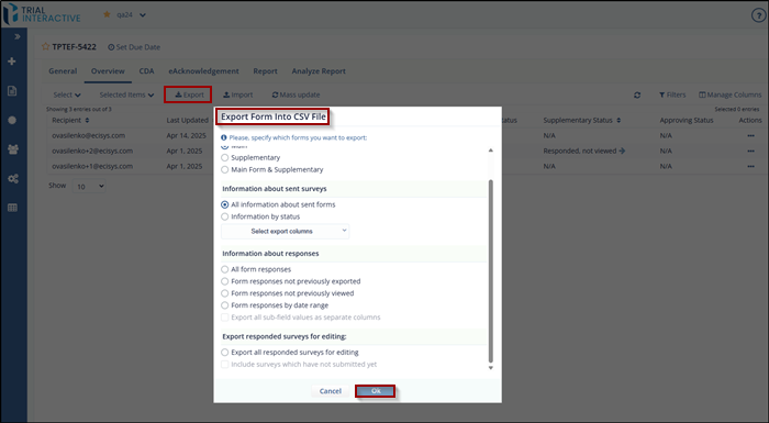 The Export allows users to download form data, including survey responses and status information, in CSV format to support easy analysis and recordkeeping. With this enhancement to the Export Report, users can now export Supplementary Form data in both CSV and Excel formats. This provides greater flexibility by allowing data export only the Supplementary Form data or separately from Main Form responses.