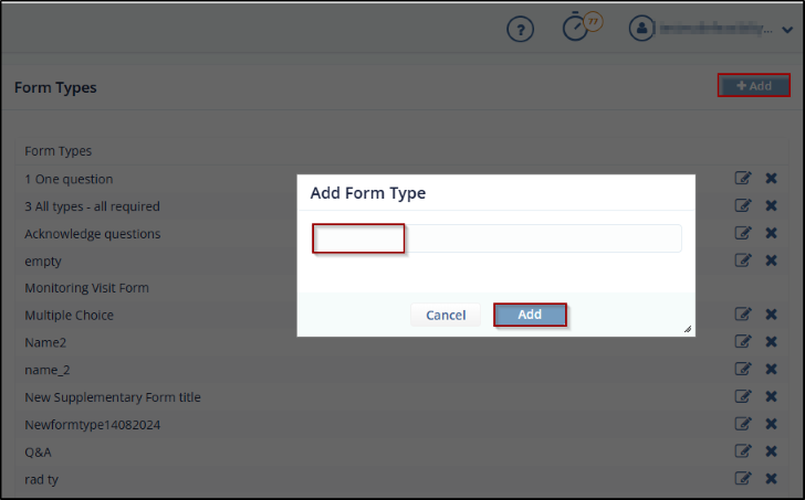 - Click the Add button from the Form Types section. The Add Form Type dialog box