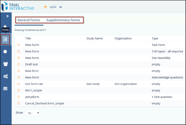 The Forms section provides a tabular view of all created forms and surveys, allowing users to manage their lifecycle and track their usage.