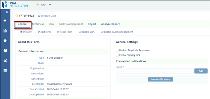 The General tab provides an overview of the form, including its type, creator, creation and update timestamps, and basic statistics like the number of responses and survey activity.