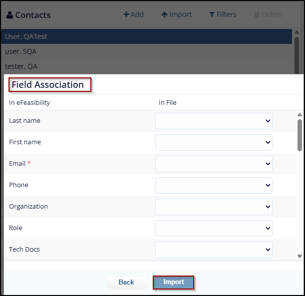The system gives an error if there are no matching fields in Source file and E-Feasibility.