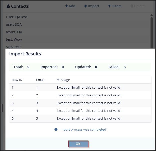 - Once the mapping is done, click the Import button. A dialog box opens displaying the progress of the import result along with the total count of Contacts, imported contacts, updated contacts and Failed import.