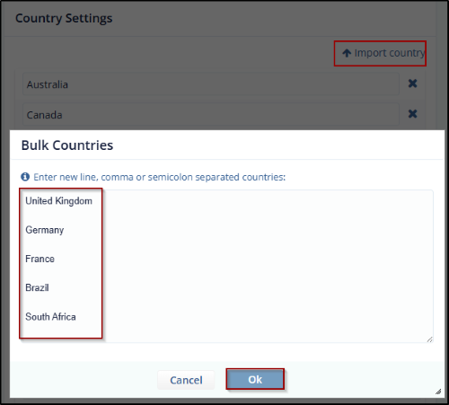 - Click the Import country button from the Country Settings. The Bulk Countries dialog box opens which provides a long text box to enter the list of countries and two buttons: Cancel and OK.