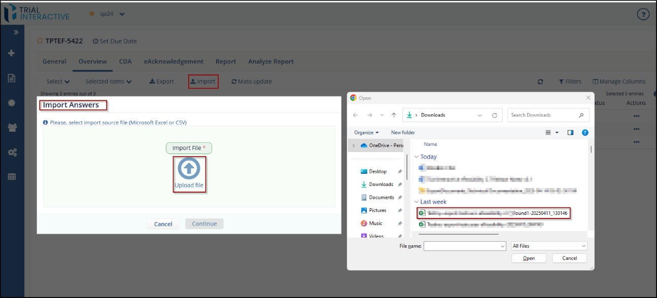 The Import Answers popup window is displayed that provides an Upload button to import the file along with two buttons: Cancel and Continue. The Continue button is deactivated by default and activated only when the source file is uploaded.