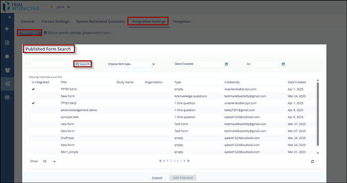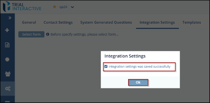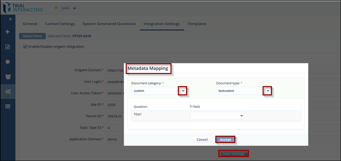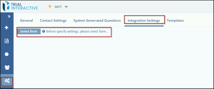 The Integration Settings allow you to map a form and replicate it into an integrated Trial Interactive (TI) folder. These settings are applicable only to published forms.