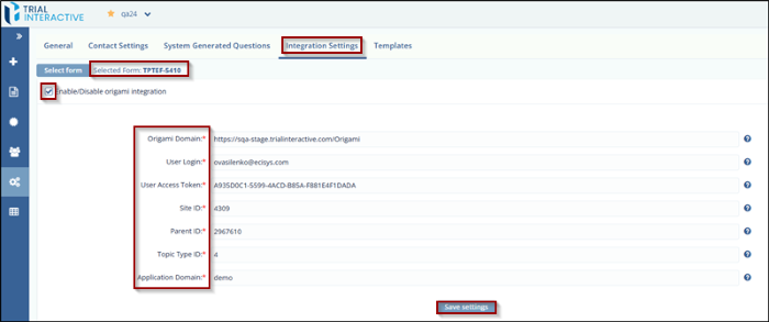 - Check the Enable/Disable Origami Integration checkbox to activate the integration settings.