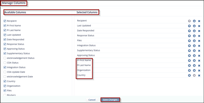 - In the example, PI First Name, PI Last Name, Organization, and Country have been selected and are now listed under Selected Columns.