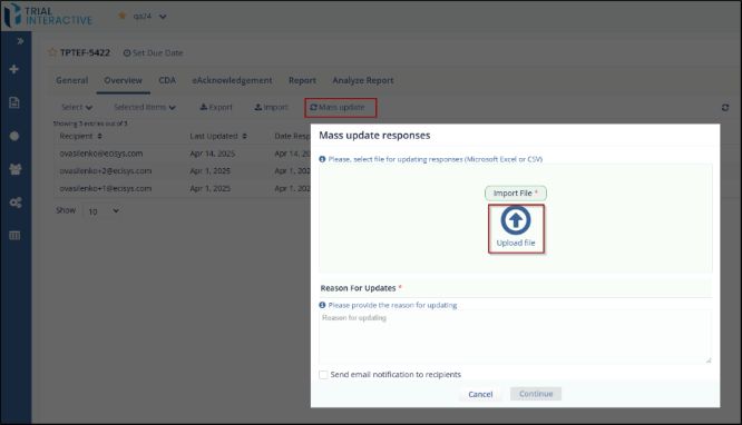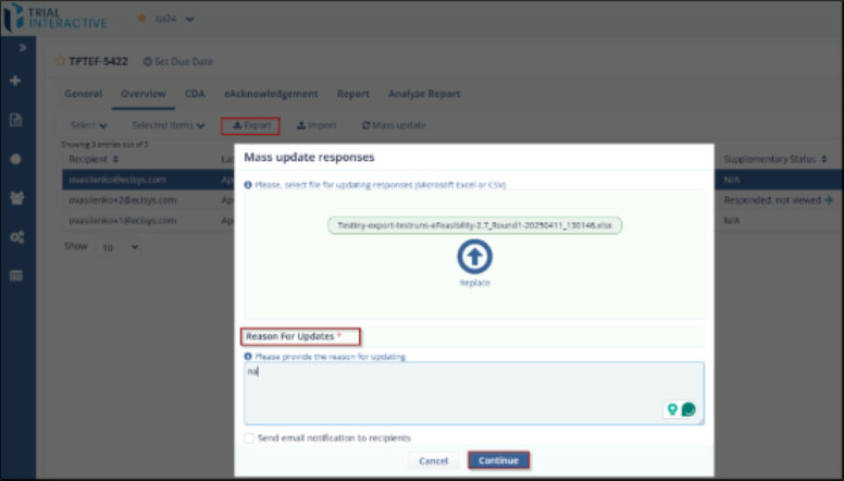 The Mass Update functionality in Trial Interactive allows users to update multiple survey responses at once using an Excel or CSV file. This is particularly useful when bulk changes are required across several recipients or records, improving efficiency and consistency.