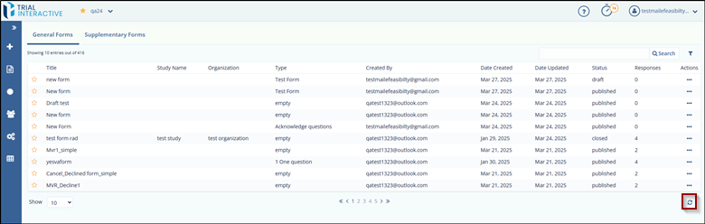 Refreshing the Forms page resets all changes and settings applied to the page, including filters, sorting, or column customizations.