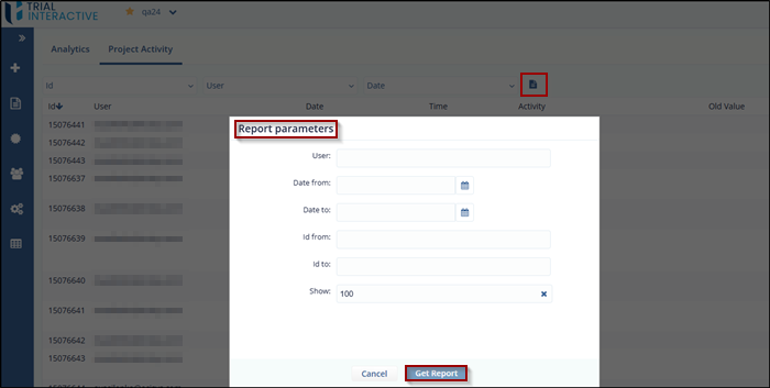 - From the Project Activity tab, click the Report Parameters icon. The Report Parameters dialog box will open.