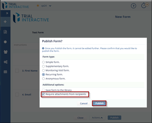 Selecting Require attachments from recipients on a Publish Form dialog box restricts the submitter from submitting the questionnaire without the attachment.