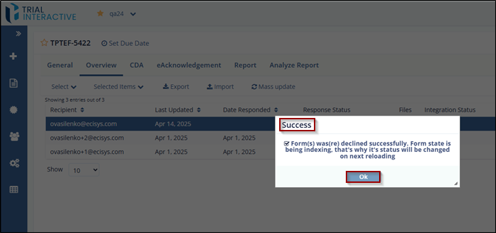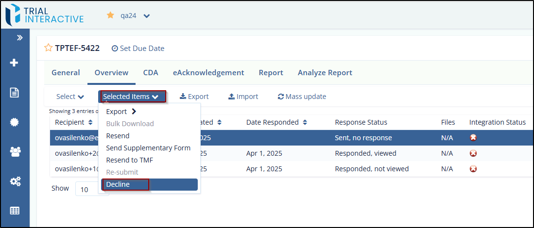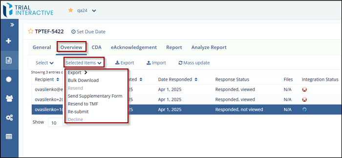 - Resend to TMF – Resubmit the form response to the Trial Master File system.