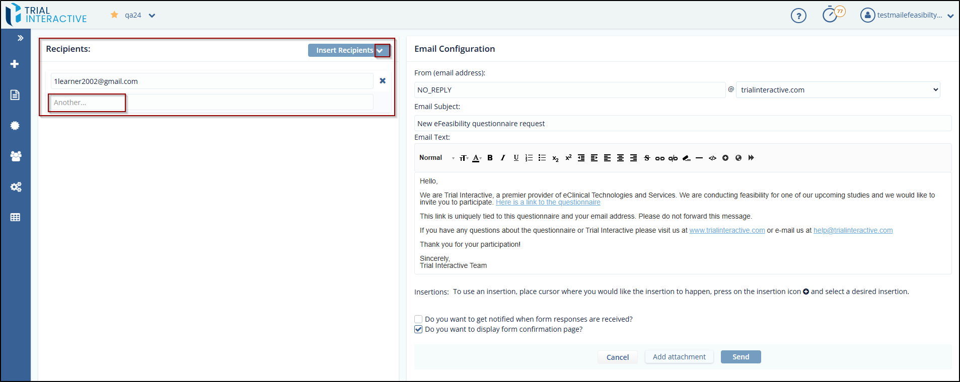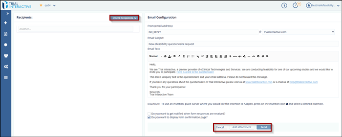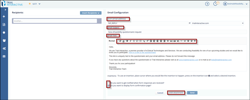 The Cancel, Add Attachment and Send buttons in the Email Configuration section.