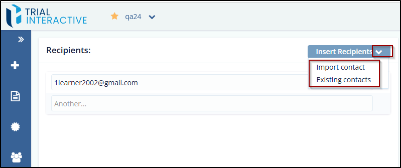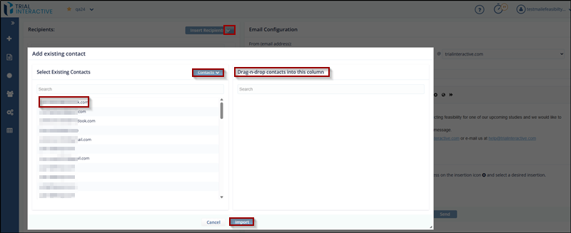 - Click the Insert Recipients dropdown. A list appears which displays two options: Import Contacts and Existing Contacts.