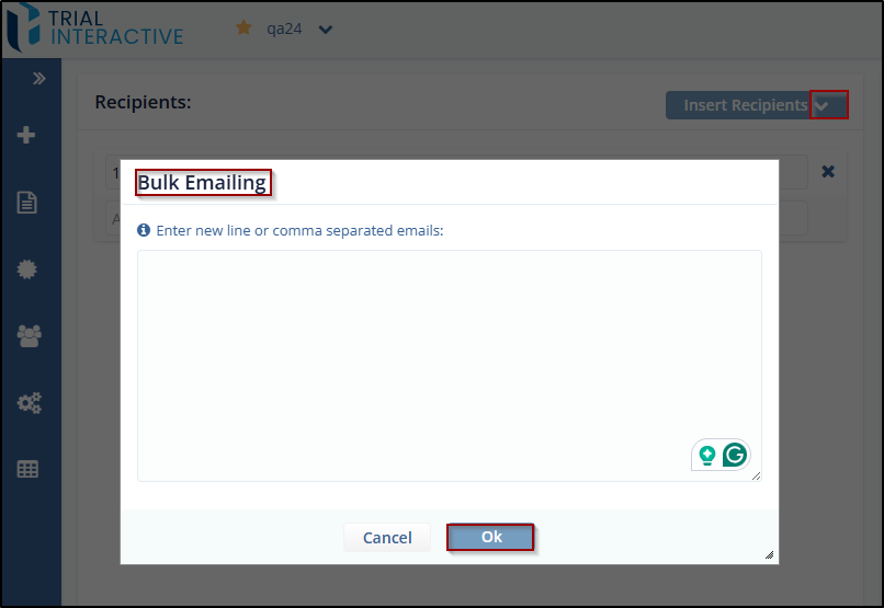 Select Import Contacts. The Bulk Emailing pop up window is displayed which provides a long text area to enter emails of recipients. Follow the instruction mentioned above the textbox to enter emails.