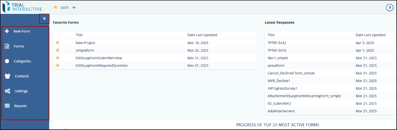 The Toggling Side Navigation on the left of the dashboard allows you to access several functionalities. The functionalities appearing here are based on the accessibility level of the user. Click the double arrow to expand or collapse the Toggle Sidebar Navigation. Click each marked area for further details of the functionality.