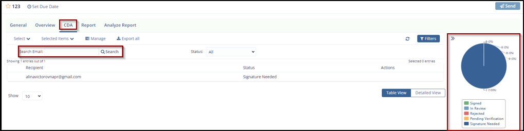 - Right section: Shows Pie Charts representing the distribution of CDA statuses
