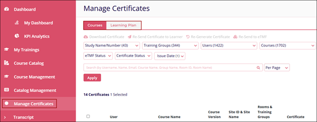 - Click on the Courses tab to view the status of certificates for individual courses.