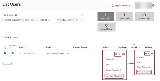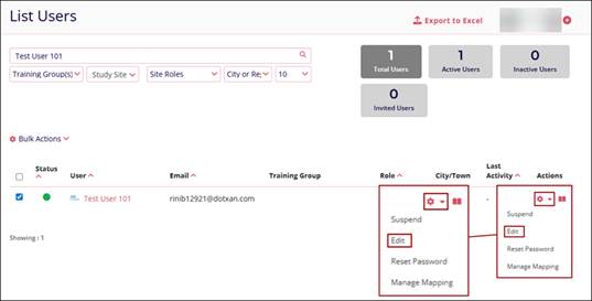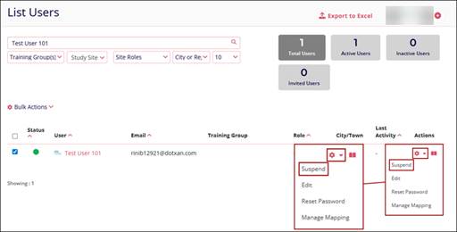 - Click on the Actions dropdown of an Active User.