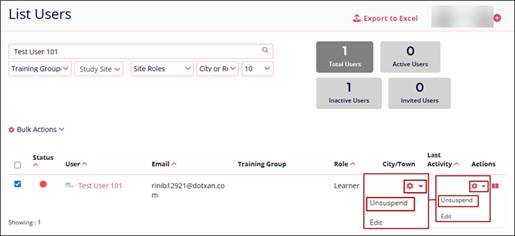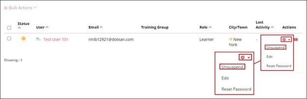- To activate the user, click on the Actions dropdown and select the Unsuspend