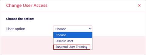 - On the Change User Access screen, click on the User option dropdown and select the Suspend