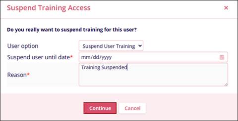 - On the Suspend Training Access screen, enter a date till which the user's training will remain suspended, and the reason justifying the suspension.