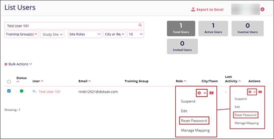 - Click on Reset Password from the Actions Dropdown