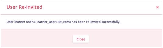 - The User Re-invited screen displays the message of successfully sending the activation