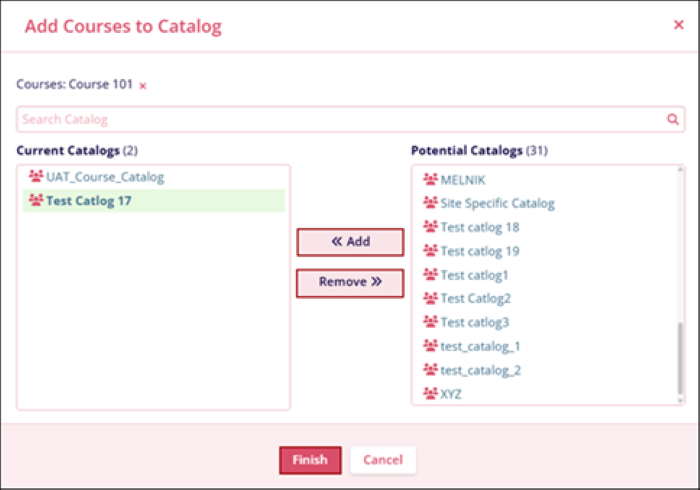 - On the Add Course to Catalog screen, select a catalog from the Potential Catalogs section and click on the << Add button.
