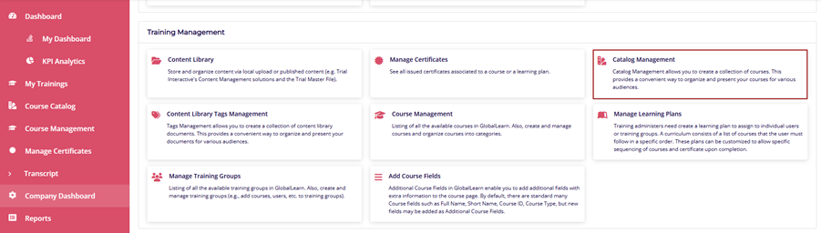 The Catalog Management module allows users to create a collection of courses, providing a convenient way to organize and present courses for various audiences.