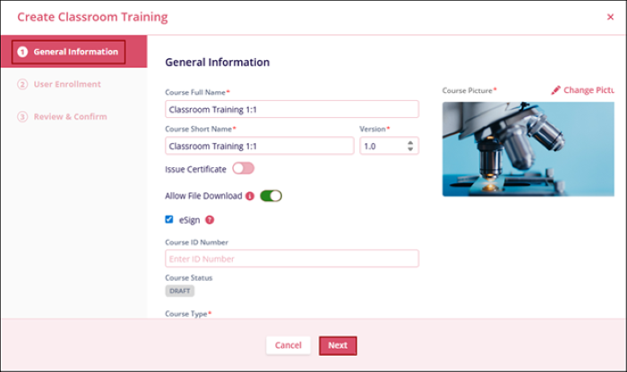 The Classroom Training option grants users the ability to support live, instructor-led courses. Using this type of course, managers can confirm that a course has been completed with evidence and course materials, allowing the Learner to eSign the course. The class is held live in a classroom, but the attendance is stored online along with certificates and signatures if the user requires it. Classroom trainings are synchronous trainings that are given to any learner outside of the learning management system.