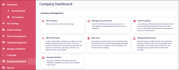 The Company Dashboard gives Admins access to essential, basic, and advanced settings for creating and managing courses in GlobalLearn. It enables Company Admins to oversee Company Management, Training Management, User Management, Reports, and Settings in GlobalLearn.