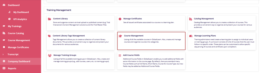 The Course Management Module lists all the available courses in GlobalLearn. Users with appropriate permissions can create, manage, and organize courses into different categories.