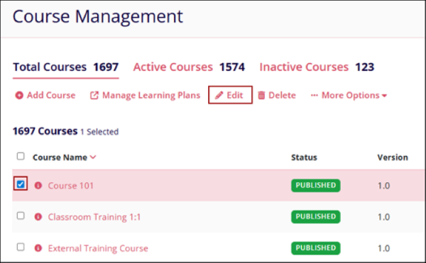 - From the Course Management screen, select a course by clicking on the checkbox.
