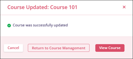 - The Edit Course screen displays the success message. Click on Return to Course