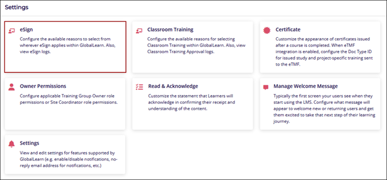 The eSign setting allows users to configure selectable reasons for use wherever eSignatures are required within GlobalLearn. Users can also view the corresponding eSignature logs.