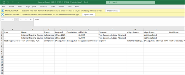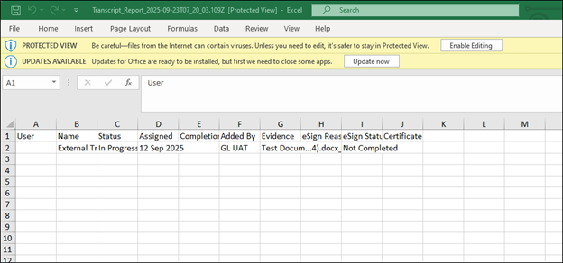 On the Transcript Record tab, an individual user's external training details can be viewed.