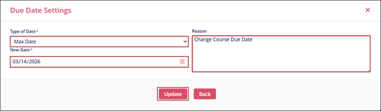 The training window or due date may sometimes need to be extended for learners enrolled in courses created with a Max Date or Max Days. For such courses with max date or days, learners are required to complete the course within the defined timeline.