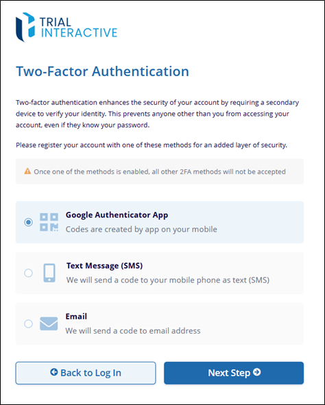 - On the Two-Factor Authentication page, select any one of the authentication methods
