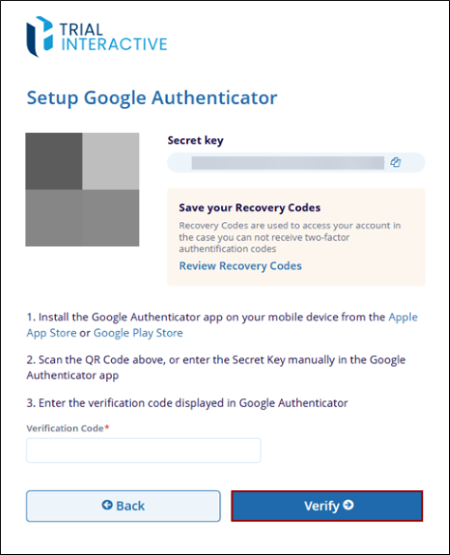 - Scan the QA code on the Setup Google Authenticator page or enter the Secret Key in the Google Authenticator app.