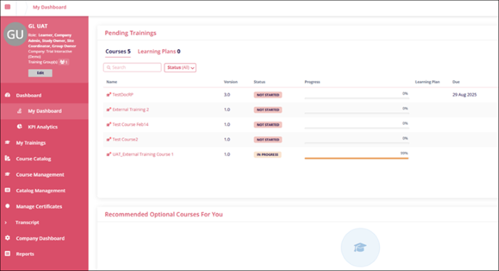 - Depending upon the user role, the left-hand navigation pane will be populated accordingly, and certain dashlets will not be visible.