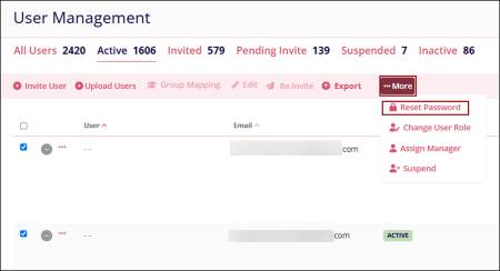 The Reset Password option sends an email notification to users with a link to reset their password. This option is available only for users with an Active or Suspended status.