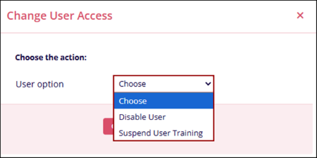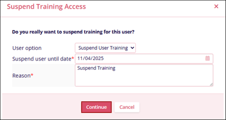 The Suspend option allows Admin users to temporarily pause a user’s training for a defined period or to locally disable the user’s account.