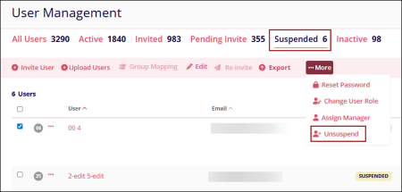 - Select a user from the ‘Suspended’ tab and click on the ‘…More’ dropdown.