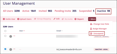 - Select a user with ‘Inactive-Local’ status from the ‘Inactive’ tab.